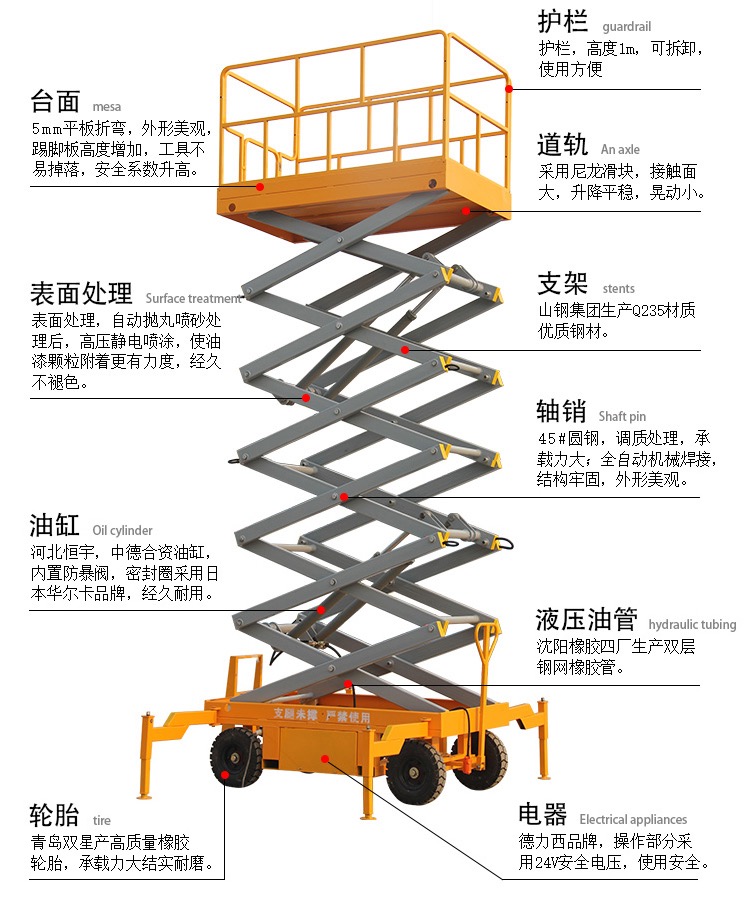 升降平台主若是经过液压油的压力传动从而完成升降的性能,它的剪叉机械结构,使升降机起升有较高的安稳性,宽阔的功课平台和较高的承载实力,使高处功课界线更大、并合适多人同时功课。它使高处功课效率更高,平安更保障。